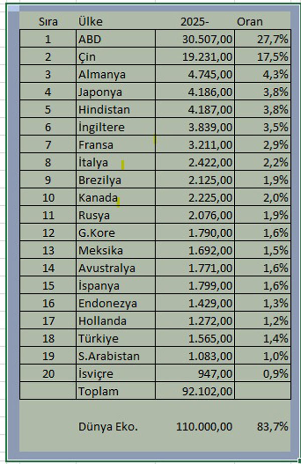 2025 yıl sonu ekonomi bilgilerine ülkelerin ekonomik hacimleri ve doğal olarak bu hacimlerin sıralanması gerçekleşti.