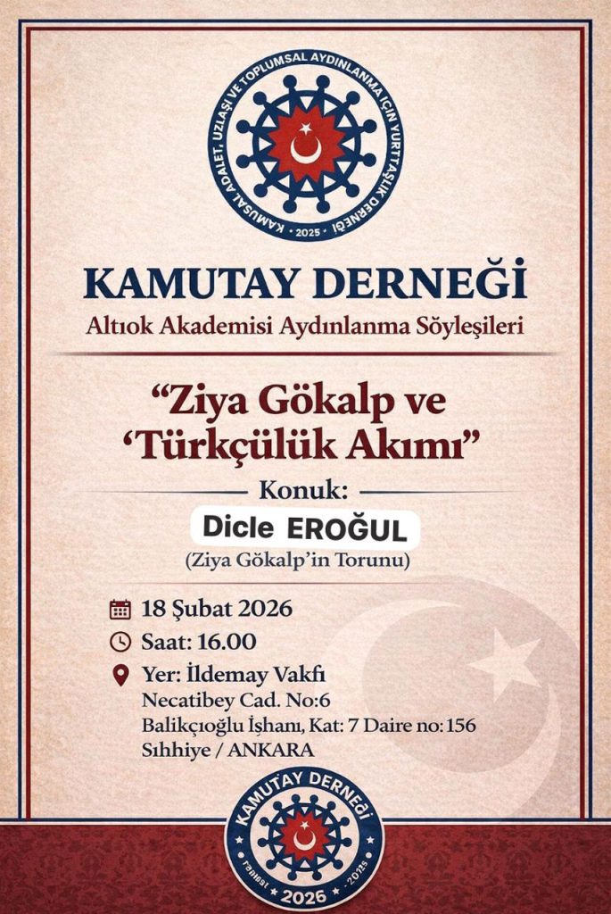 ALTIOK AKADEMİSİDUYURULARETKİNLİKLER (Dernek, Vakıf, Sendika Etkinlikleri)KAMUTAY ZİYA GÖKALP VE TÜRKÇÜLÜK AKIMI Şubat 17, 2026 PUSULA 262 Görüntüleme 0 Comments Altıok, Altıok Akademi, Altıok Akademisi, kamutay, kamutay derneği, kamutay ne demek, kamutay nedir, türkçülük akımı, ziya gökalp